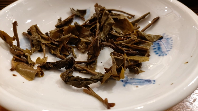 엽저를 몇 개 꺼내 확인해 보니 가장 왼쪽의 어린잎을 보면 다른 잎에 비해 돌기가 거의 보이지 않아 야생형 찻잎에 가까운 것임을 알 수 있습니다. 또한 엽저를 두 손가락으로 비벼보면 재배차는 쉽게 문드러지는데 이 차의 경우는 오랜 세월이 지났음에도 그러한 현상을 보이지 않아 교목 노수차 이상의 모료를 사용한 것이 사실임을 확인할 수 있었습니다.